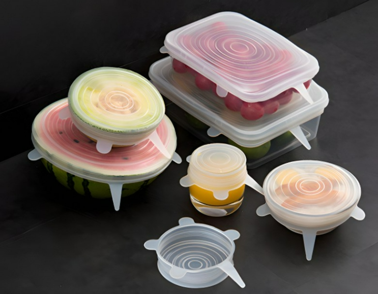 이 제품은 총 6개가 한 세트인데요, 작은 컵부터 큰 샐러드볼까지 거의 모든 식기에 맞게 늘어나요. 실리콘이 탄력 있어서 유리, 세라믹, 플라스틱 어디든 밀착돼요.