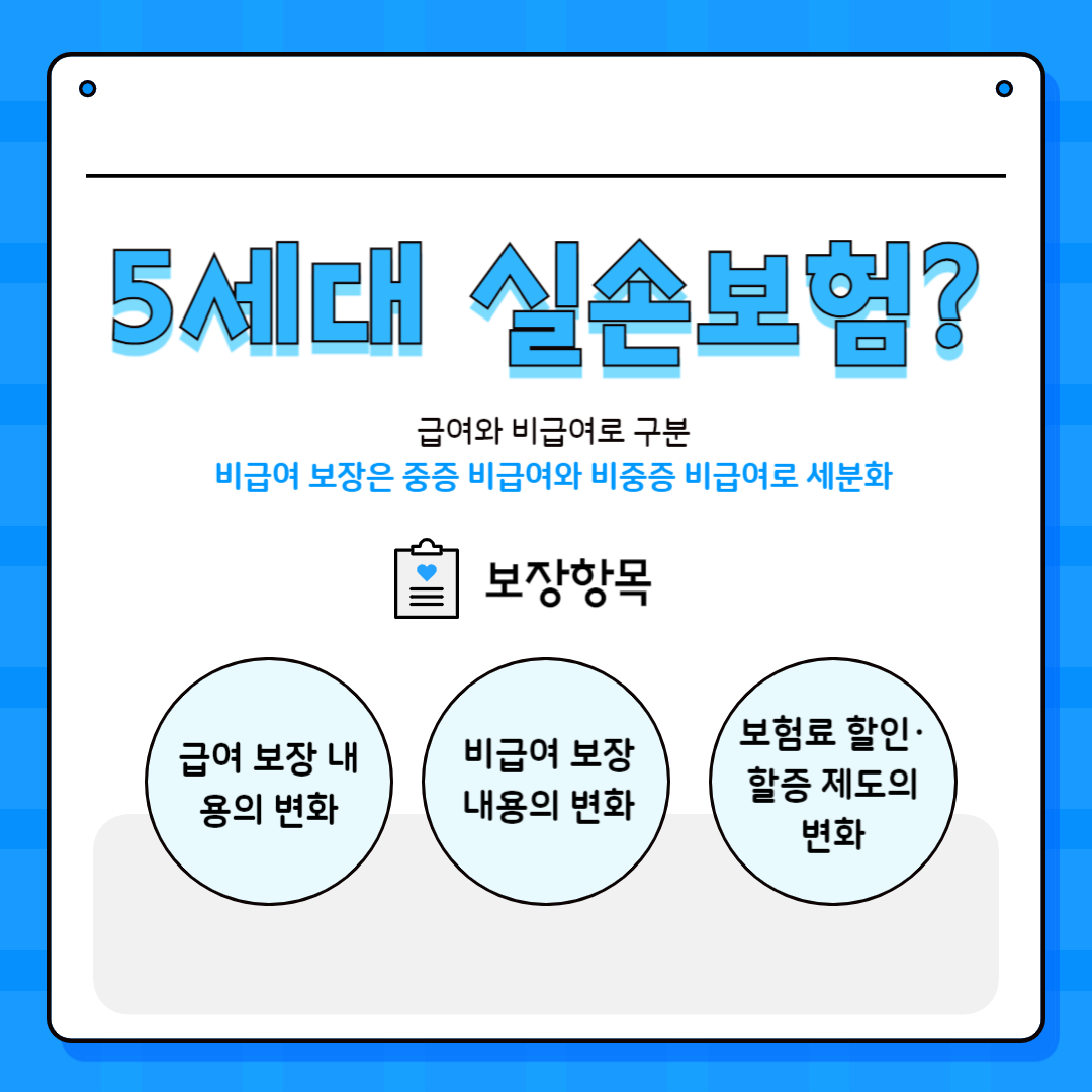 2025년 하반기 출시 예정인 5세대 실손보험, 무엇이 달라질까요? 4세대 실손보험과 보장내용, 보험료, 할인·할증 제도를 꼼꼼하게 비교 분석하고, 새로운 실손보험의 핵심 내용과 궁금증을 Q&A로 정리했습니다.