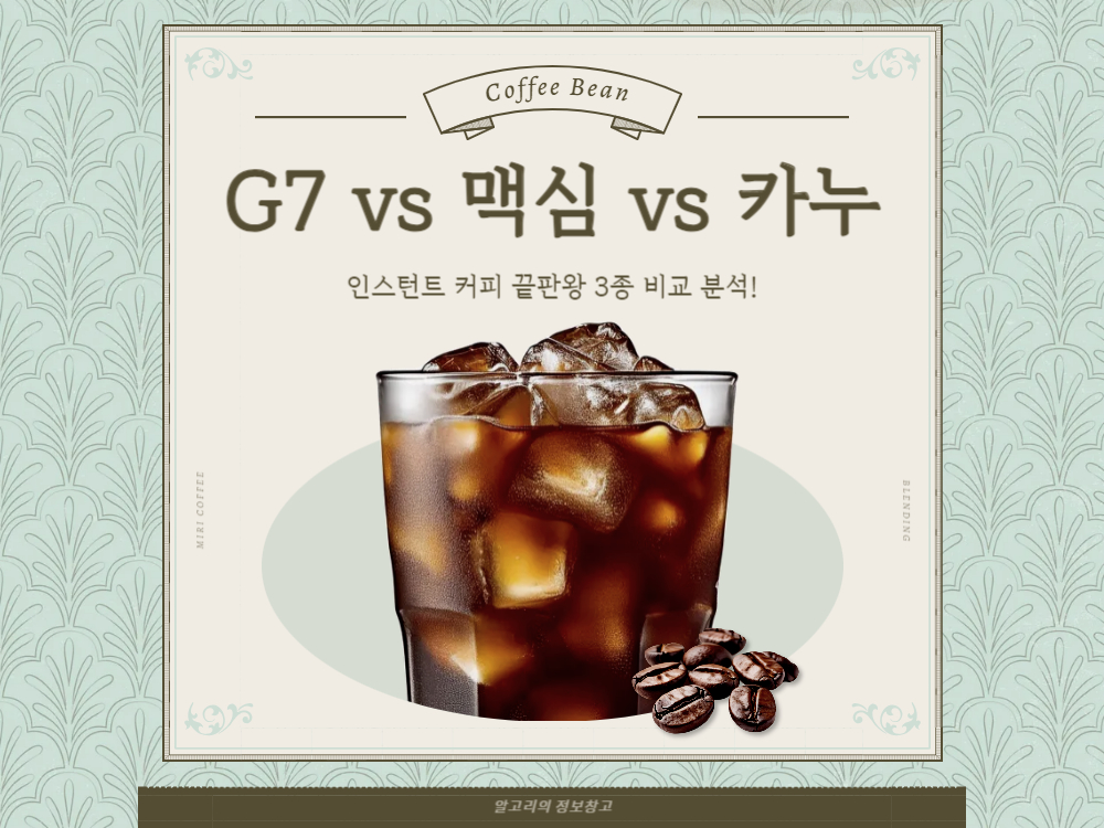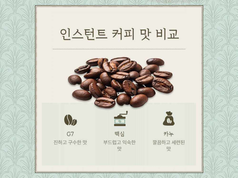 G7, 맥심, 카누 중 당신의 인생 커피는? 인스턴트 커피 시장을 평정한 세 브랜드를 맛, 향, 가격, 상황별로 꼼꼼하게 비교 분석했습니다. 솔직한 후기를 통해 당신의 취향에 맞는 커피를 찾아보세요!